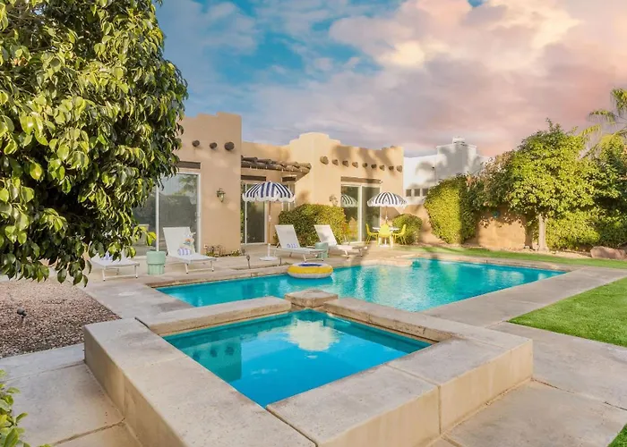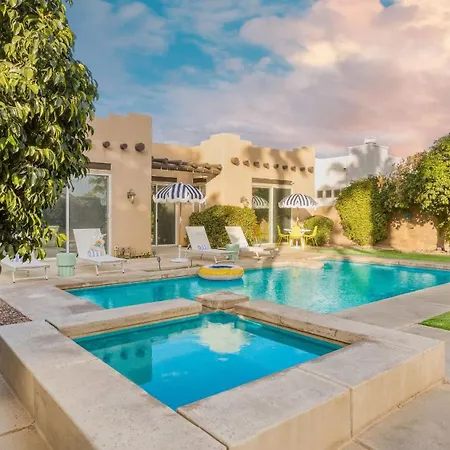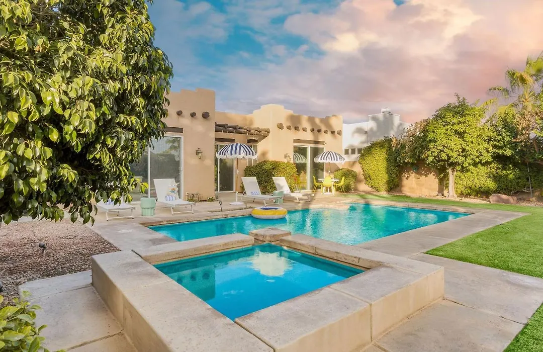 At Pool Hot Tub Yard Games Chic Midcentury Design Painted Sand By Avantstay villa, self-catering amenities include tea and coffee making equipment, a stove top, and kitchenware available in an equipped kitchen. Serving American dishes, Just Java Coffee is 650 metres away. The nearest Palm Springs International airport is 30 km away from the holiday home.
